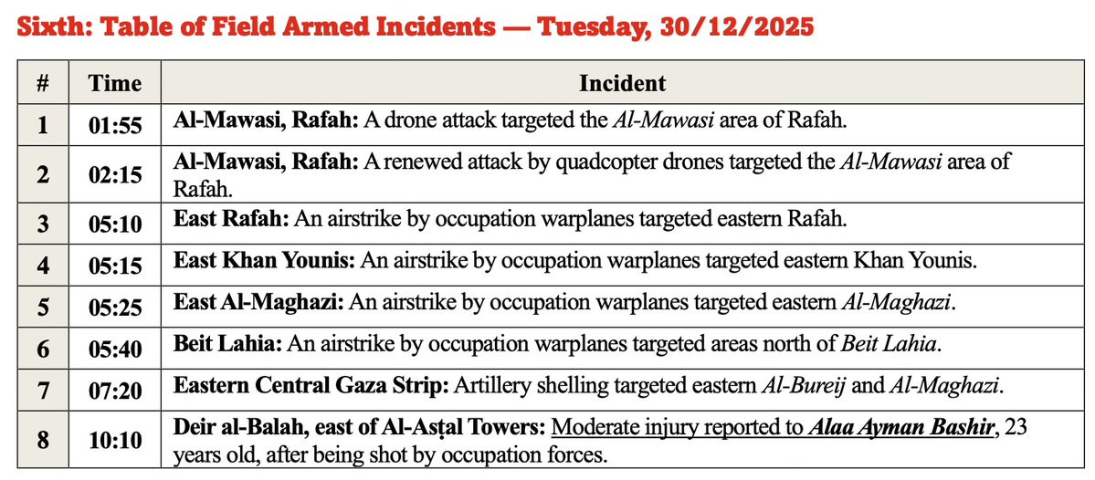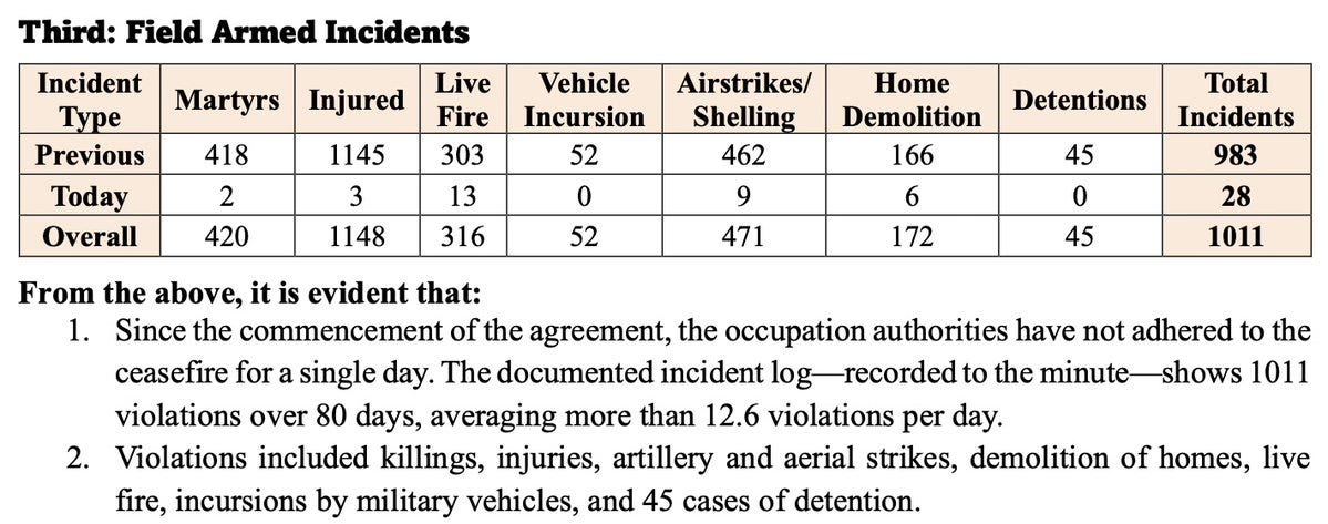 ▪️ The report emphasizes that these incidents occurred despite an active ceasefire, and were logged to the minute as part of Hamas’ daily submissions to mediators