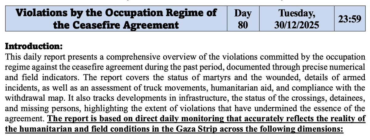 ▪️ Hamas says it is documenting Israeli ceasefire violations through daily field monitoring and submitting the findings to mediators