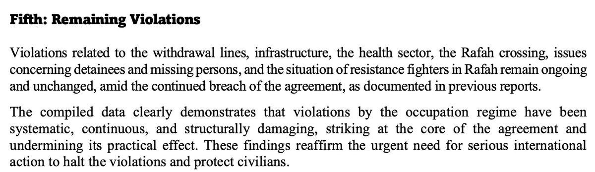 ▪️ The report states that Israeli violations are “systematic, continuous, and structurally damaging,” striking at the core of the agreement and undermining its practical effect