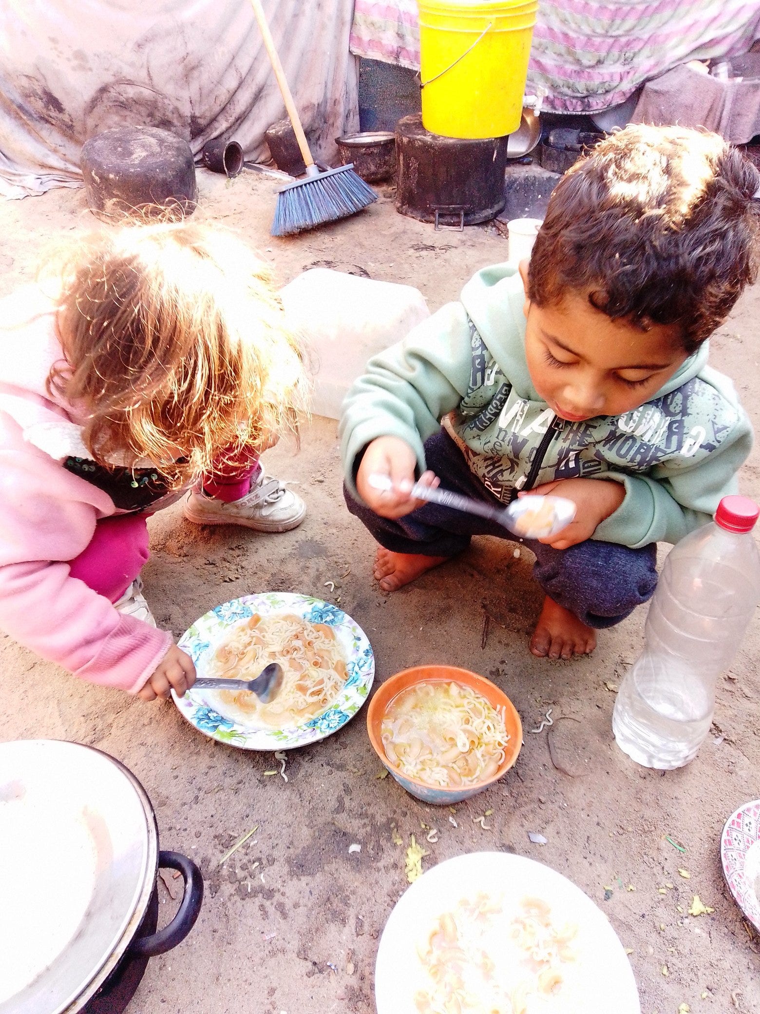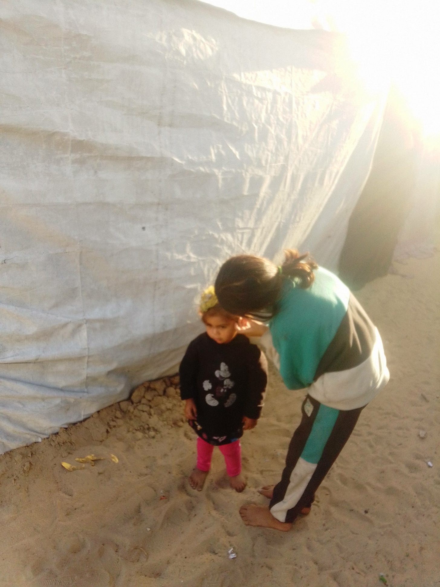 What she lives in cannot even be called a tent. There are no poles, no structure, no walls meant to keep out cold or rain. It is only a patchwork of tarps, scraps of cloth and whatever pieces of material she and her children have been able to gather. These pieces are tied together loosely, sagging and shifting with every gust of wind. Rain pours through. Cold air cuts straight in. At night, the fabric moves like a curtain, not a shelter.