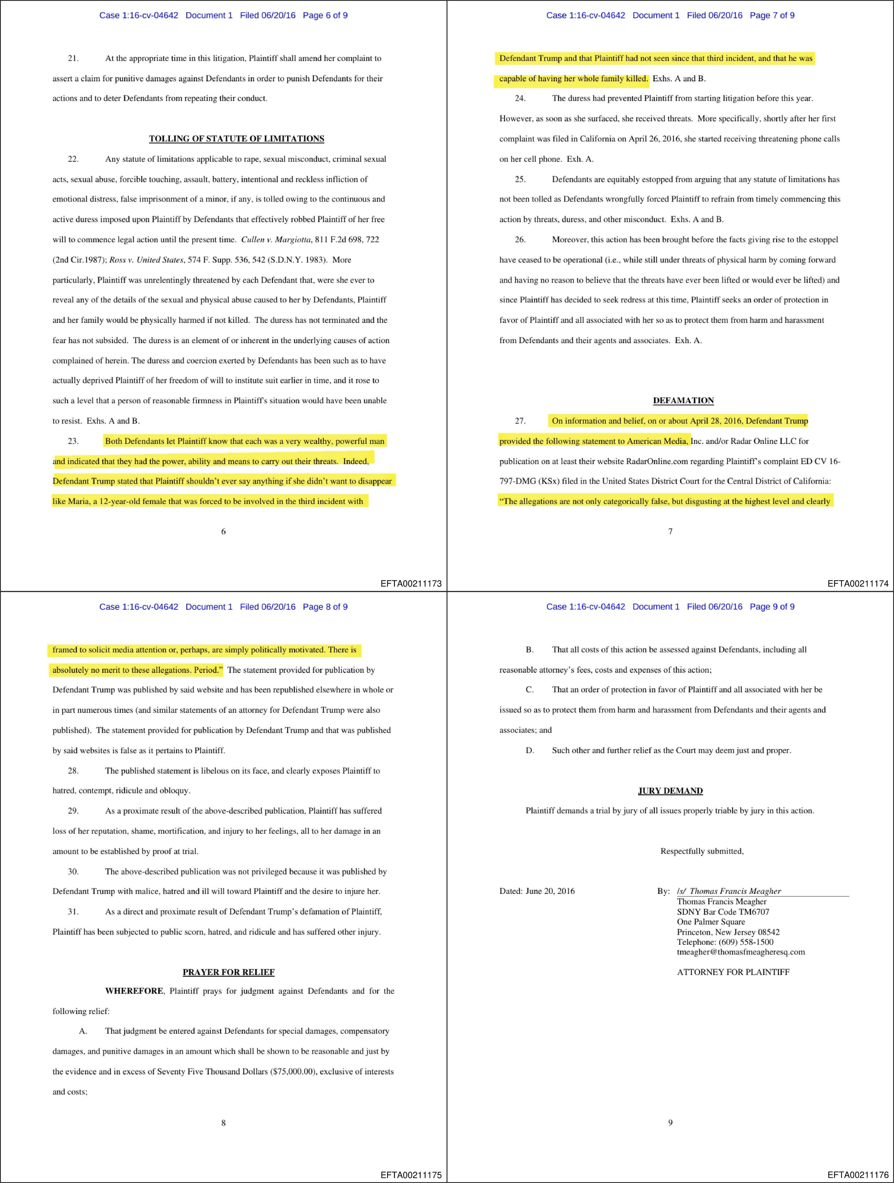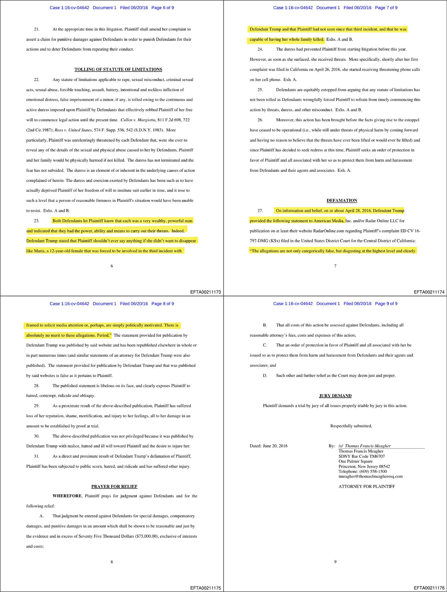“Immediately following this rape, Defendant Trump threatened me that, were ever to reveal any of the details of De fendant Trump’s sexual and physical abuse of me, my family and would be physically harmed if not killed.”