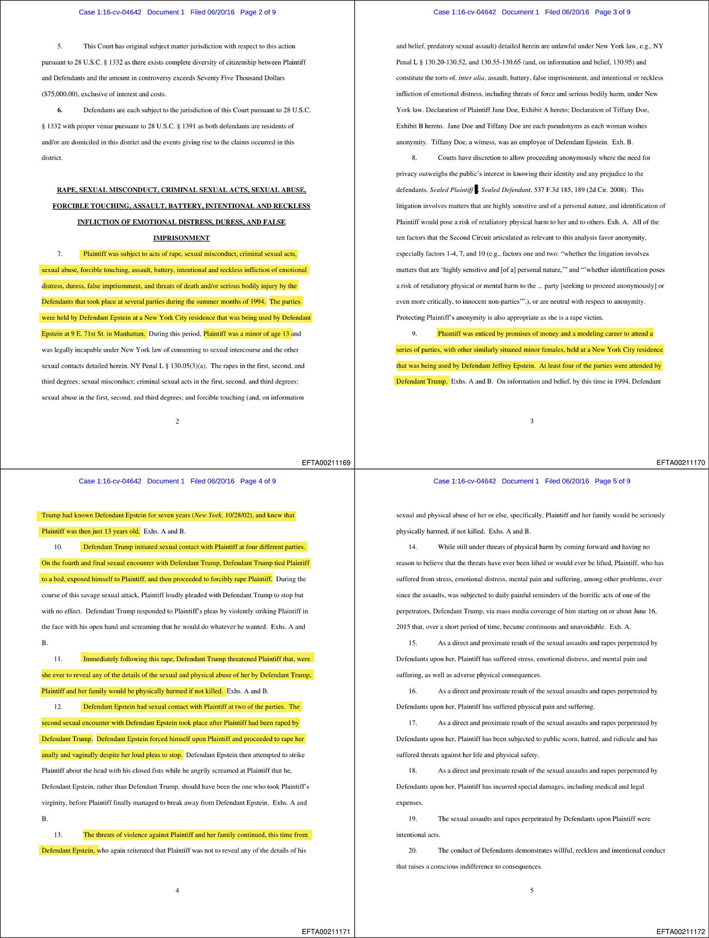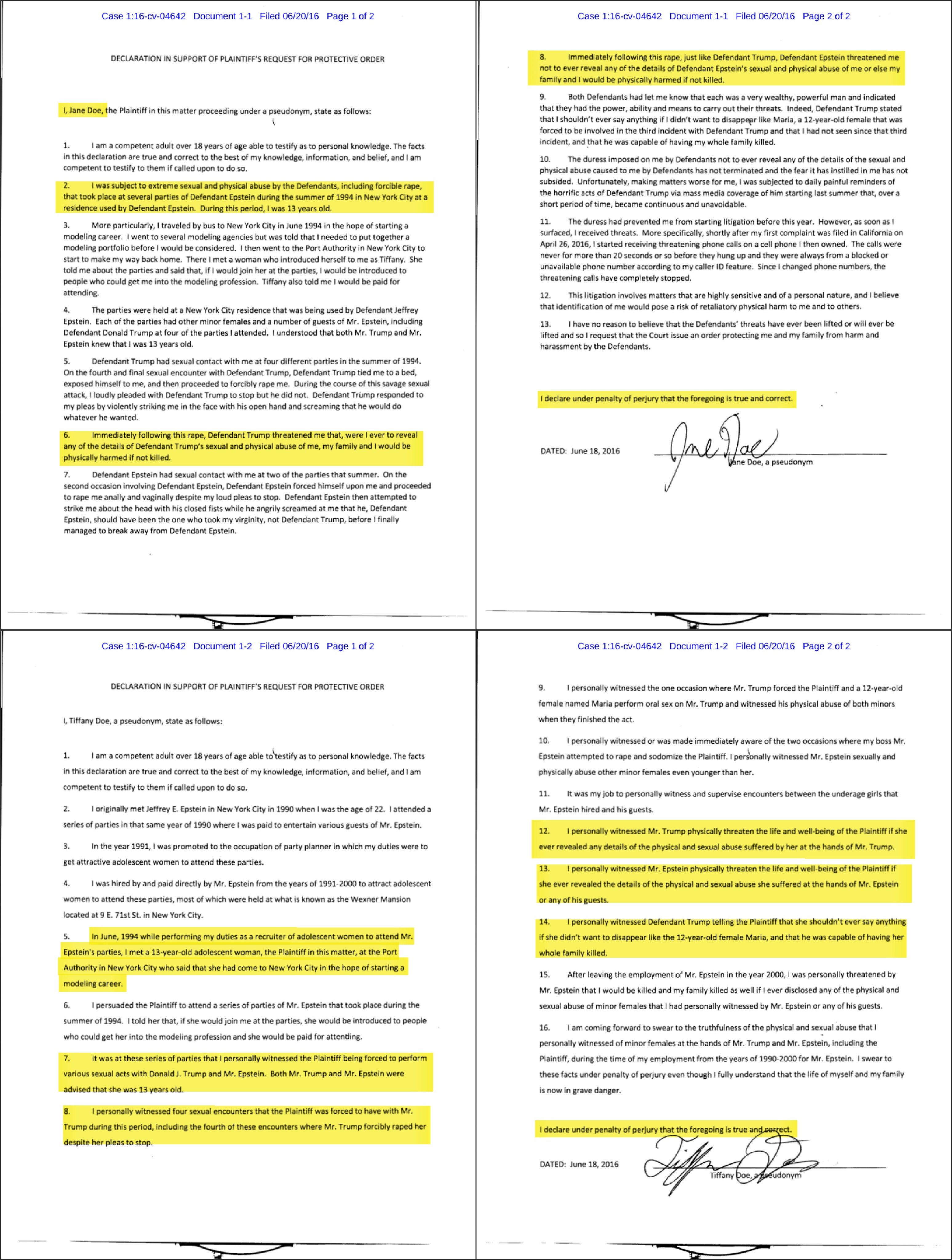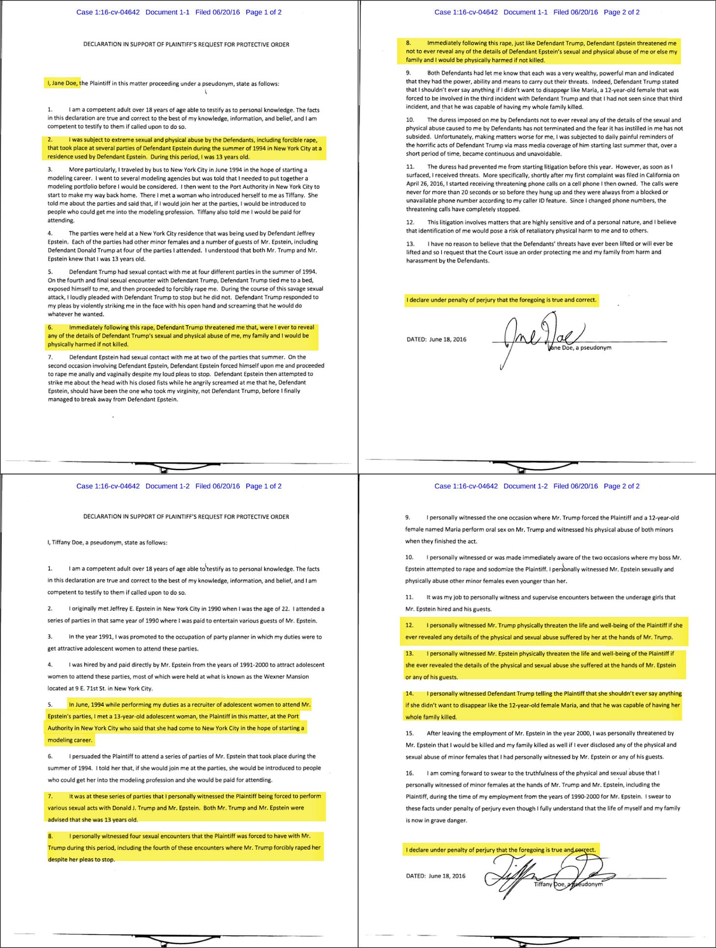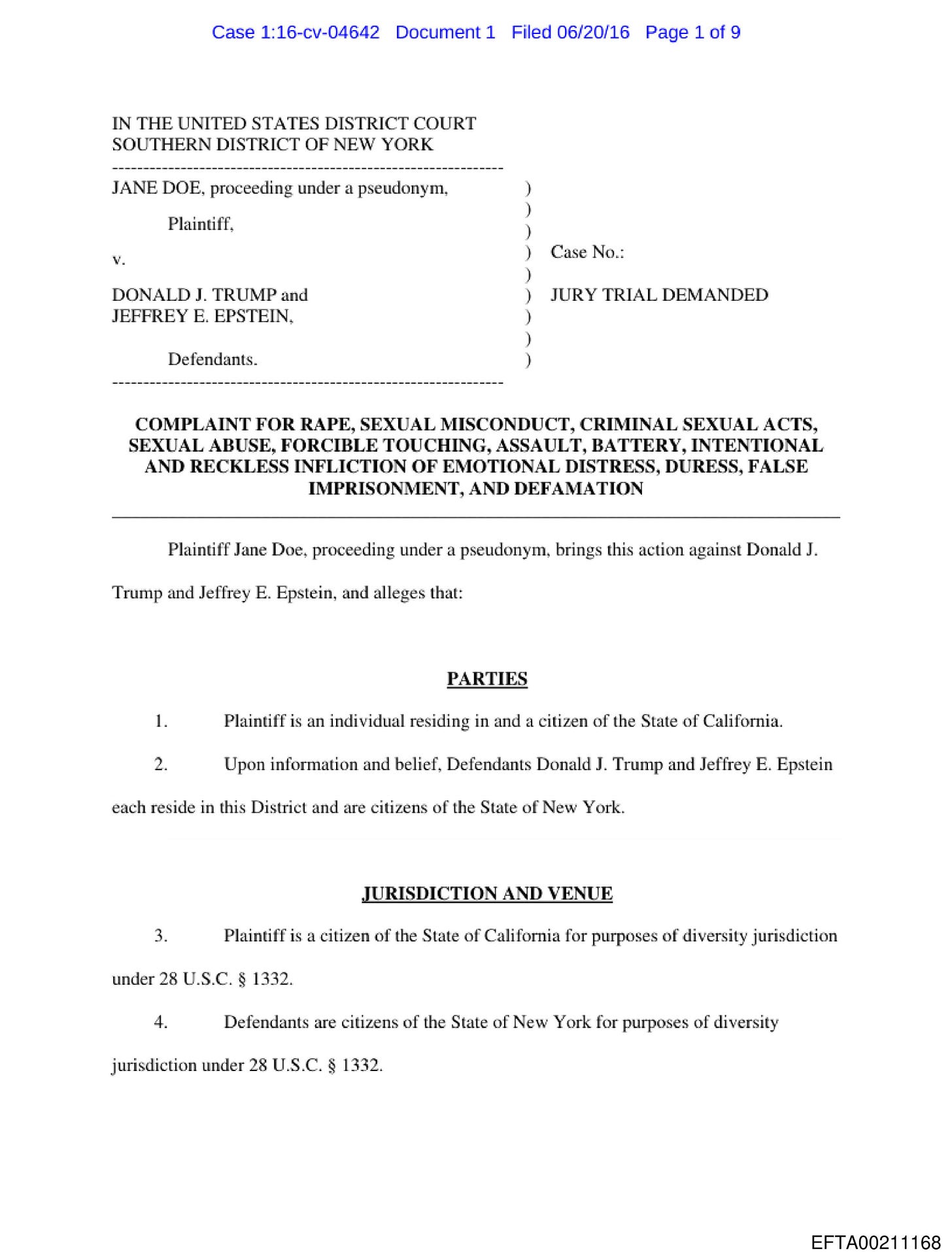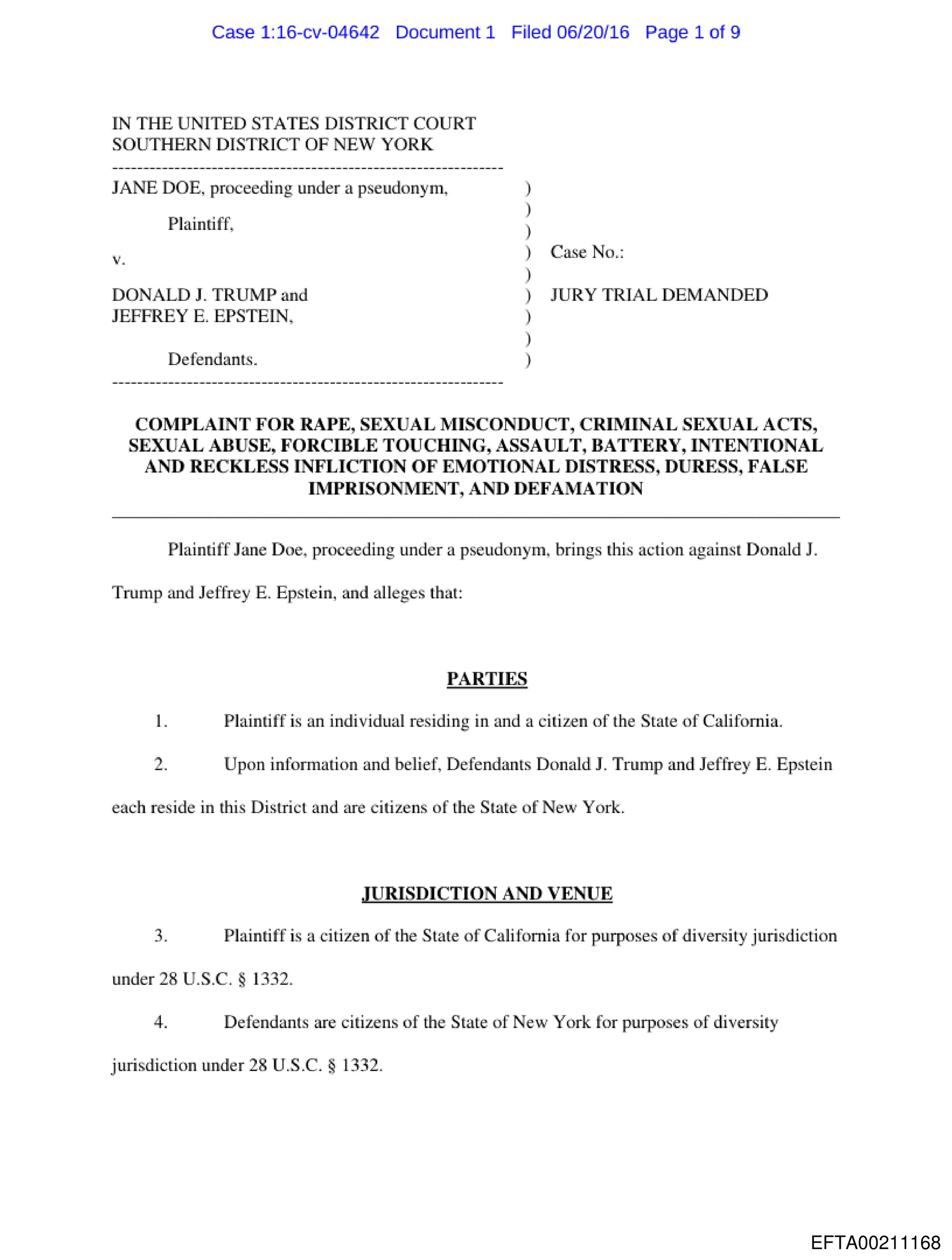 The Epstein files include a 2016 federal lawsuit in the Southern District of New York in which an anonymous “Jane Doe” alleges that Donald Trump and Jeffrey Epstein repeatedly assaulted her at Epstein’s Manhattan residence in 1994, when she was 13.
