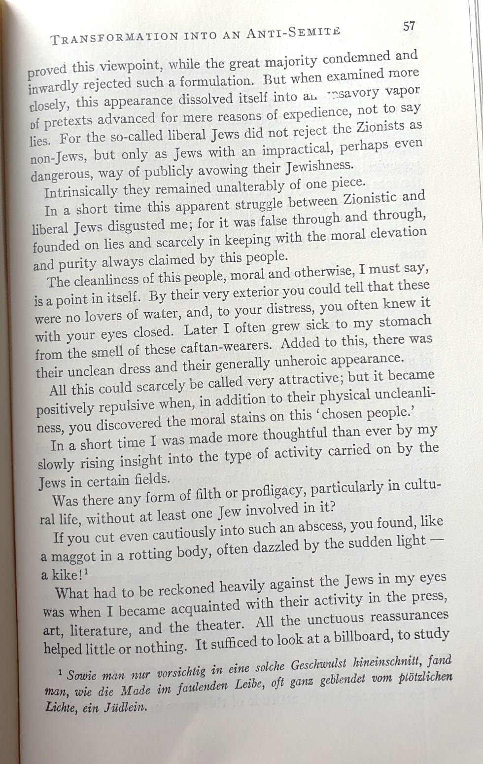 In the folliwing decade, the racial hatred of German Jews intensified, and Hitler published his Mein Kampf in 1925 (over 600 pages in the 1971 English edition) where he explicitly took the (German) readers through his transformation, from someone who felt uncomfortable with anti-Semitic expressions to someone who felt racial hatred of the Jewish people whom he called “a maggot(s) in the rotting body”…. under the subheading Transoformation into An Anti-Semite, Mein Kampf, 1971, p.57).