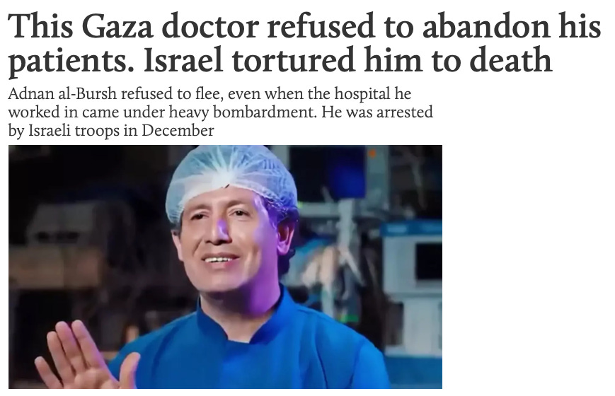However such reports have been coming out for months, without any mainstream media in the West reporting on it honestly and with the urgency it requires. One such hostage was Dr Adnan Al-Bursh, a Palestinian surgeon who refused to leave Gaza during the genocide. Dr Al-Bursh, the head of the orthopaedics department at Gaza’s Al-Shifa Hospital, was murdered at Israel’s Ofer military prison in the occupied West Bank, a facility notorious for subjecting Palestinian hostages to inhumane conditions.