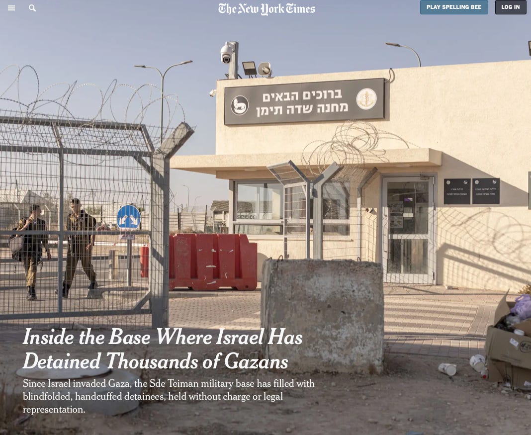 Buried somewhere in 3800 words, the New York Times revealed several cases of severe torture and human rights abuses at an Israeli torture camp in Sde Teiman, southern Israel that are nothing short of barbarism. However, since the beginning of Israel's conflict in Gaza, disturbing reports of extreme mistreatment have surfaced from within the walls of Sde Teiman. Where has the New York Times been since December last year?