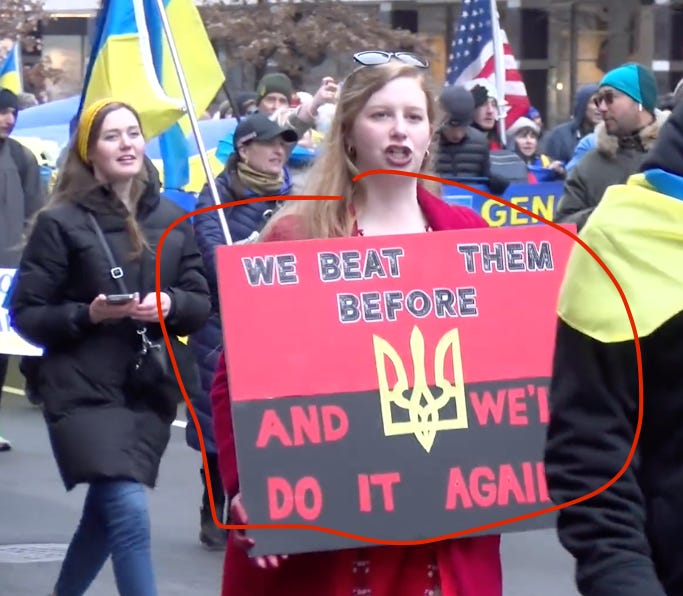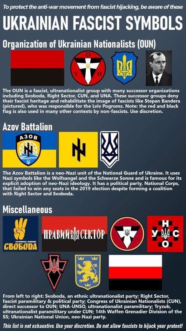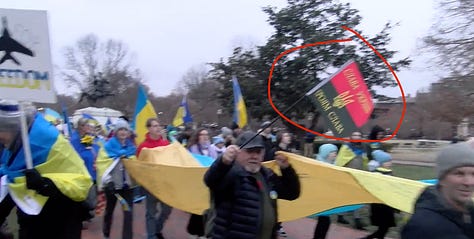 Just some of the nazi flags and placards at the "pro-Ukraine" rally. Rachel Maddow falsely claimed there were Proud boys and Trumpian nazis at the Peace rally she mocked only to fearmonger her audience. However, she is fine with pro-war rally attendees with nazi flags and insignia because this is a war led by the Democrats, and Joe Biden is not Donald Trump.