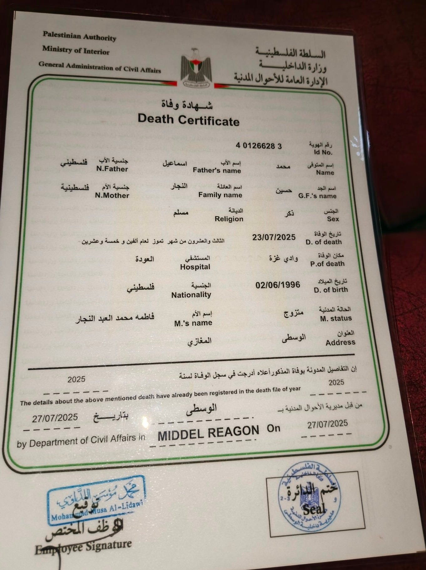 Mohamed was killed at one of the “Christian” GHF aid centers. He went there because his children were dying from starvation. Everyone in Gaza knows the danger of approaching aid points. People have been shot just for trying to reach food. He had no choice. On July 23, 2025, he went to try to bring back one bag of flour. He was killed.
